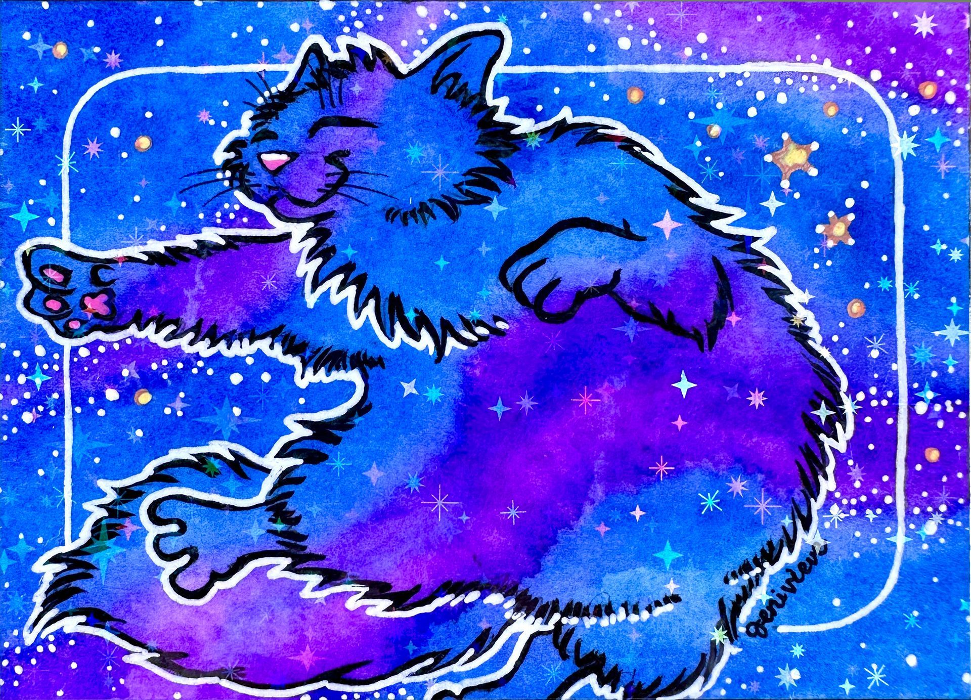 A little secret: Every Galaxy Cat is created with high-quality UV-reactive watercolor pigments that glow under a blacklight.